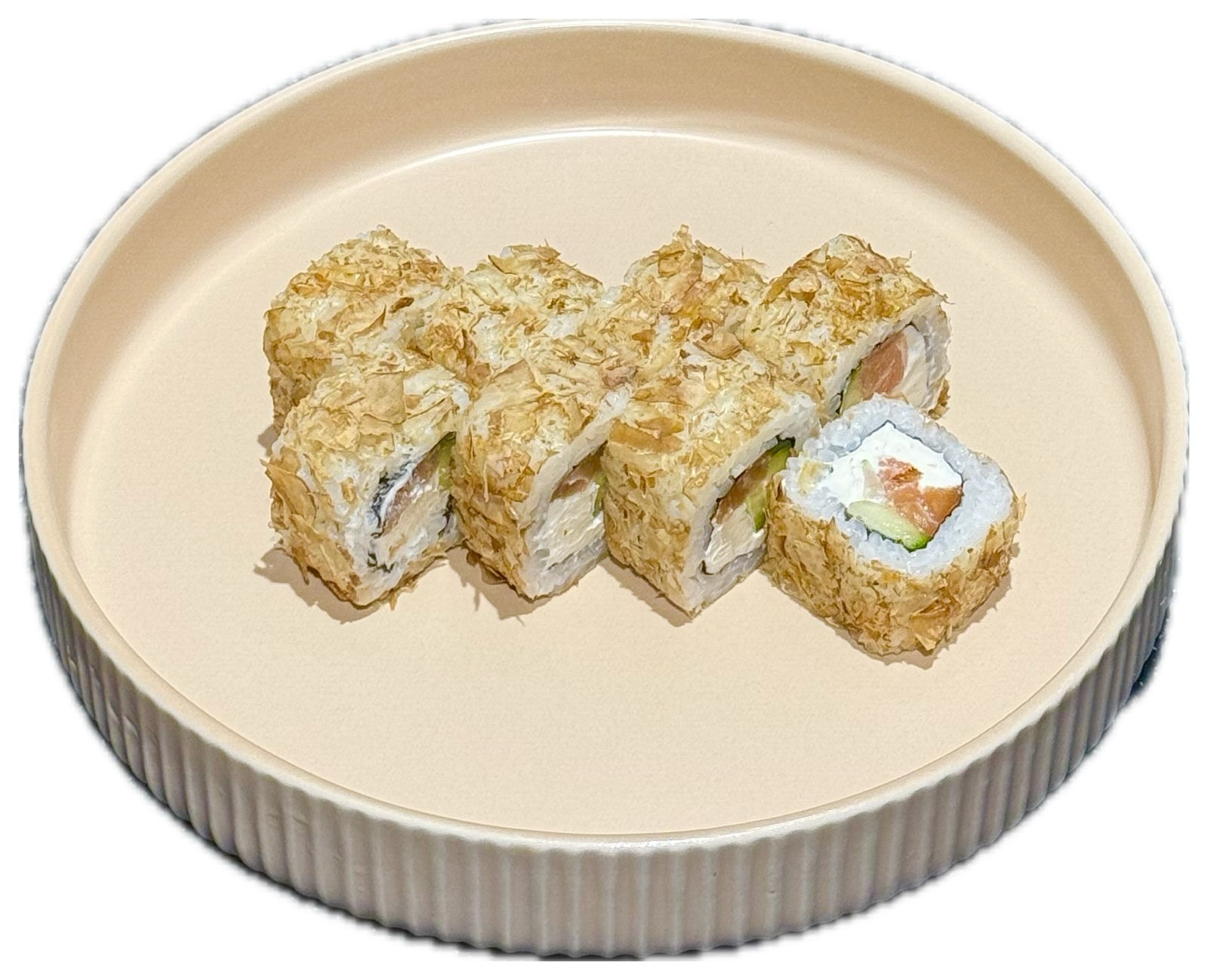 Рис, нори, сливочный сыр, огурец, лосось, стружка тунца