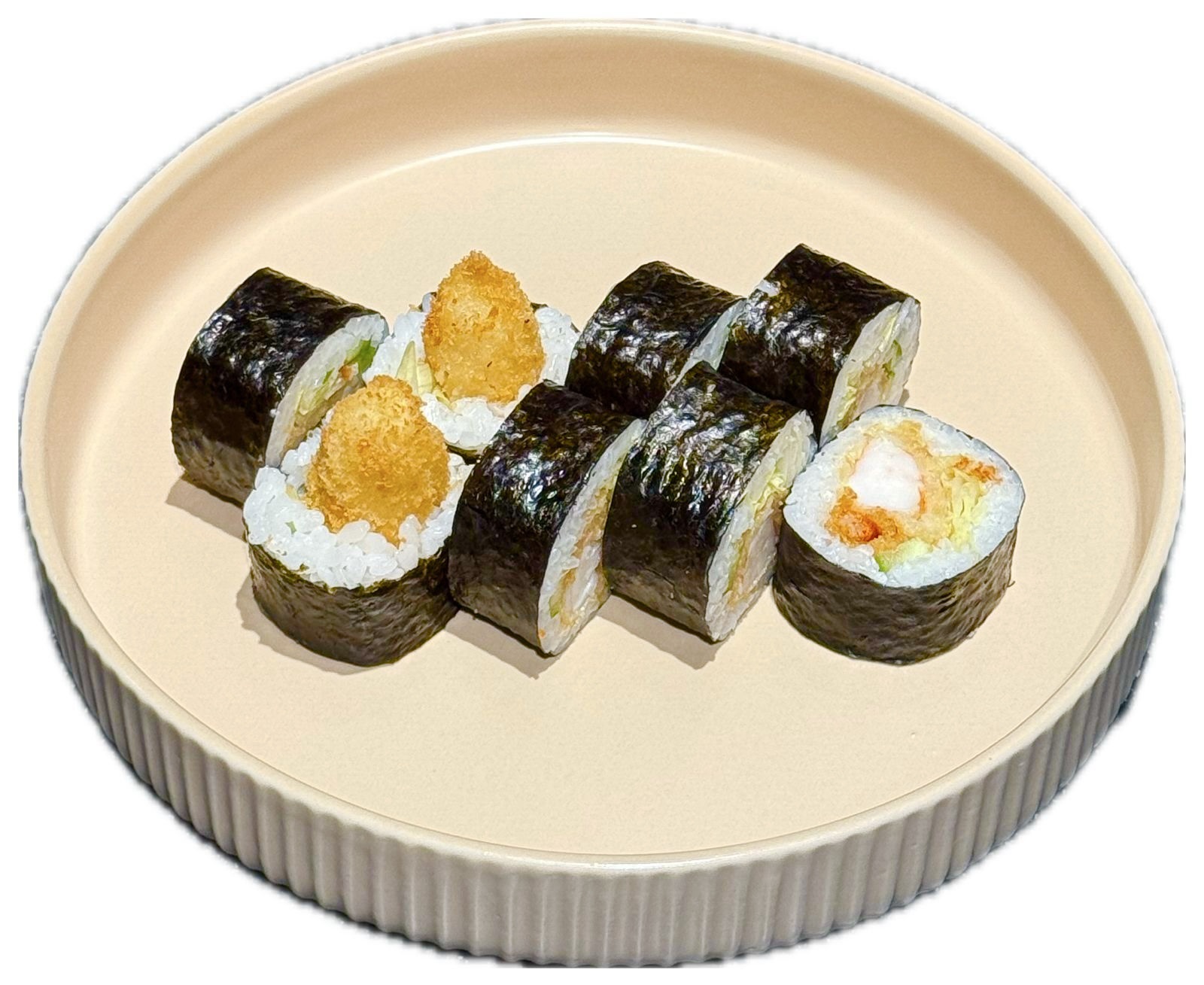 Креветка в кляре, майонез, огурец, салат айсберг.