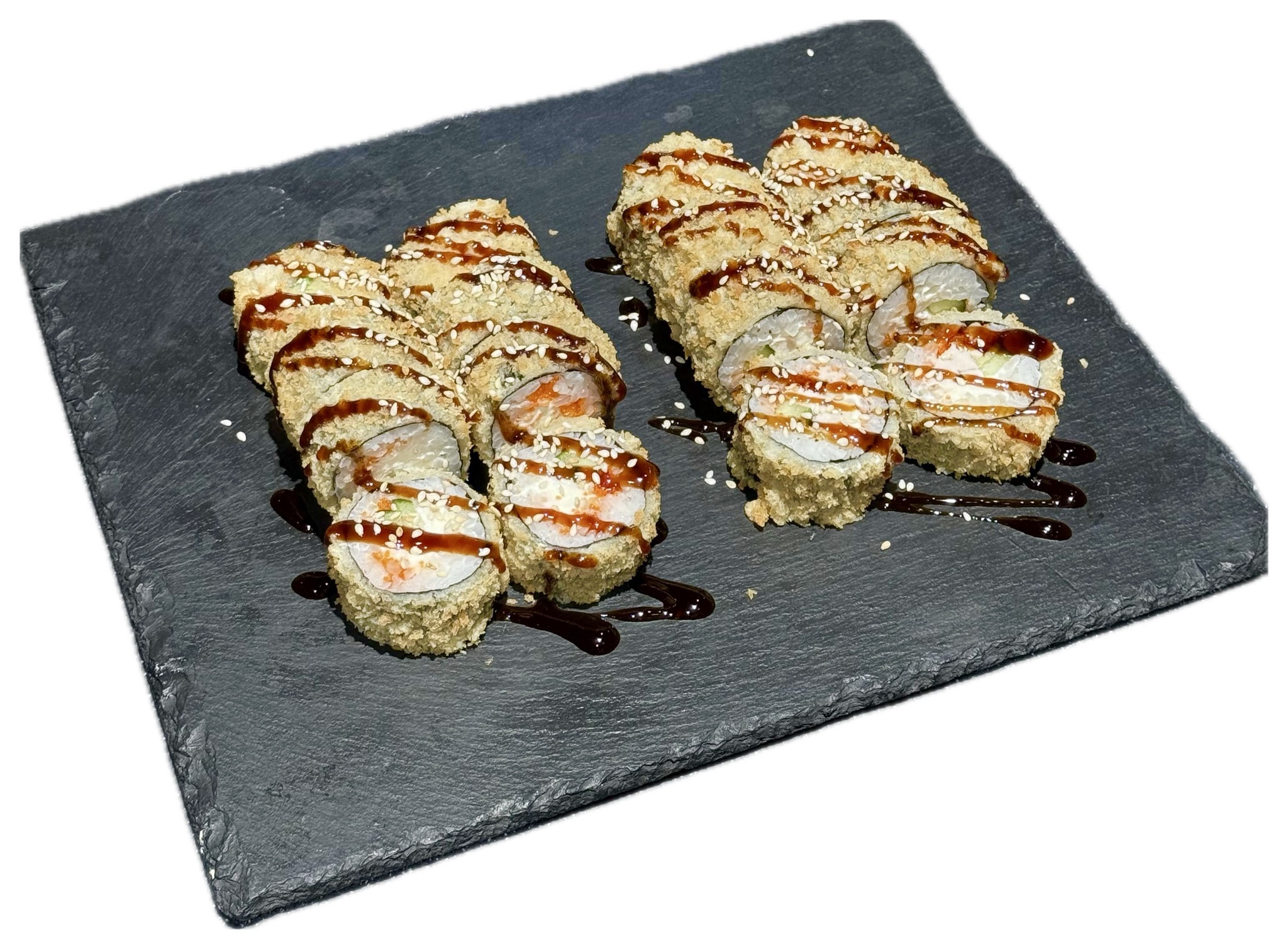 Кани темпура - Рис, нори, сливочный сыр, огурец, масаго, имитация краба, унаги соус, кунжут.