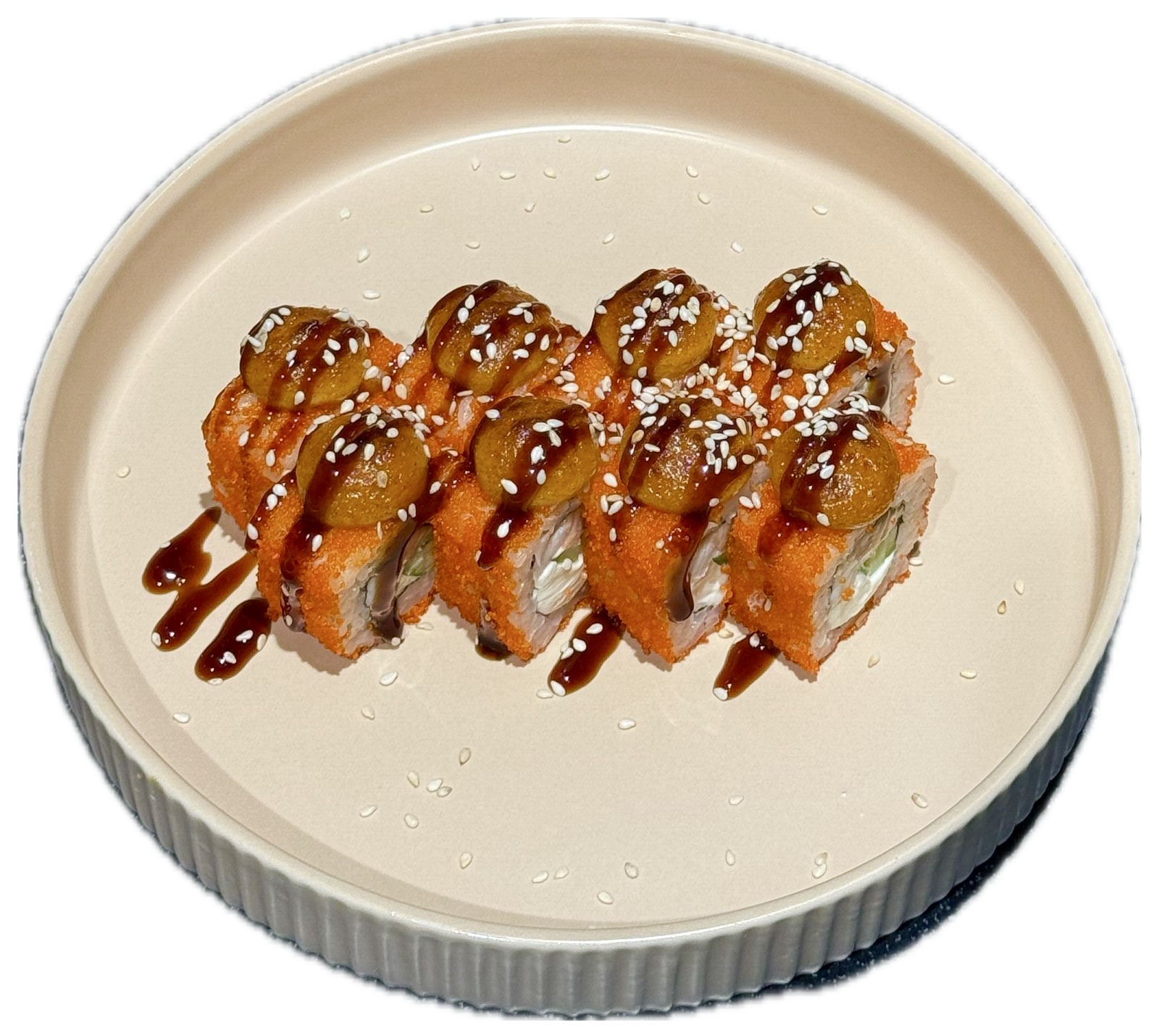 Рис, нори, сливочный сыр, огурец, лосось, тигровая креветка, масаго, спайси соус