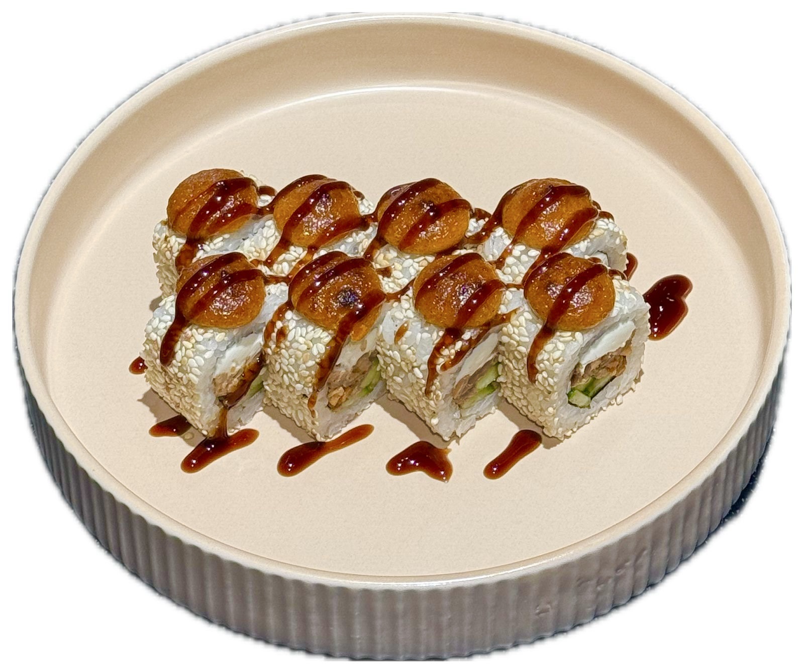 Рис, нори, сливочный сыр, огурец, лосось, кунжут, спайси соус
