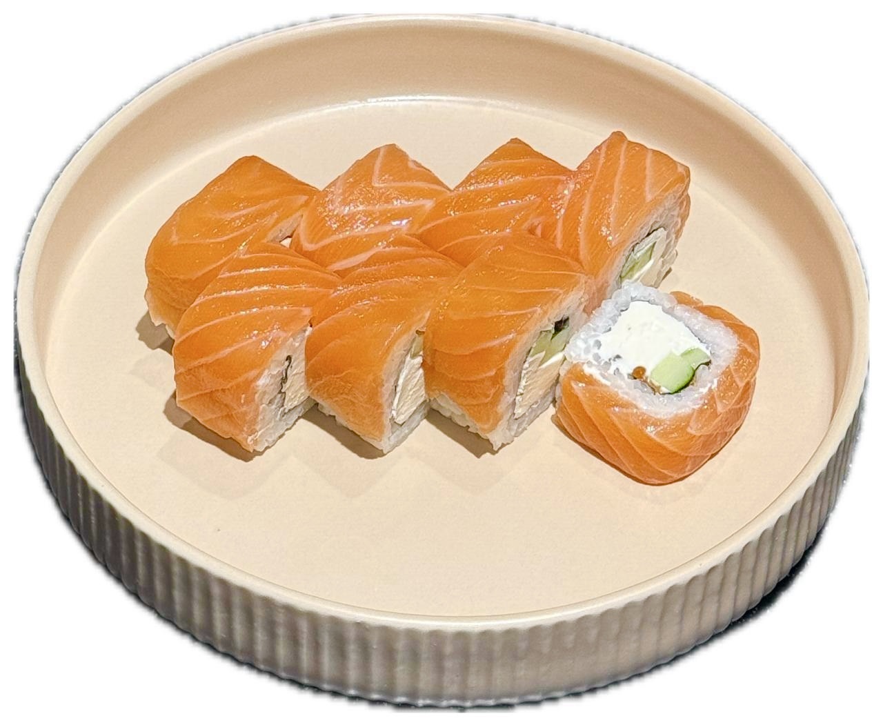 Рис, нори, сливочный сыр, огурец, икра лососевая, лосось.