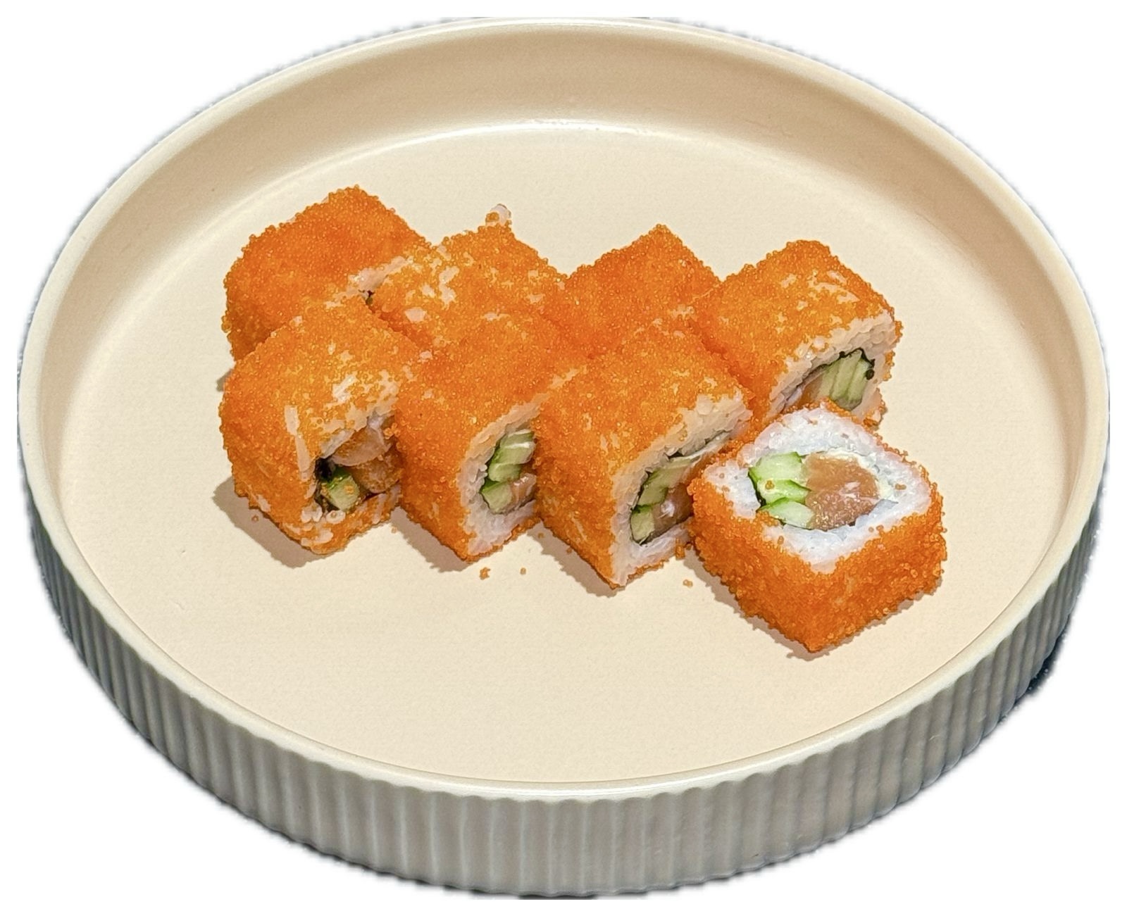 Рис, нори, японский майонез, огурец, лосось, тобико