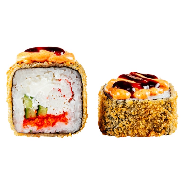 рис,нори,сливочный сыр, имитация краба,масаго,огурец, спайси соус, унаги соус