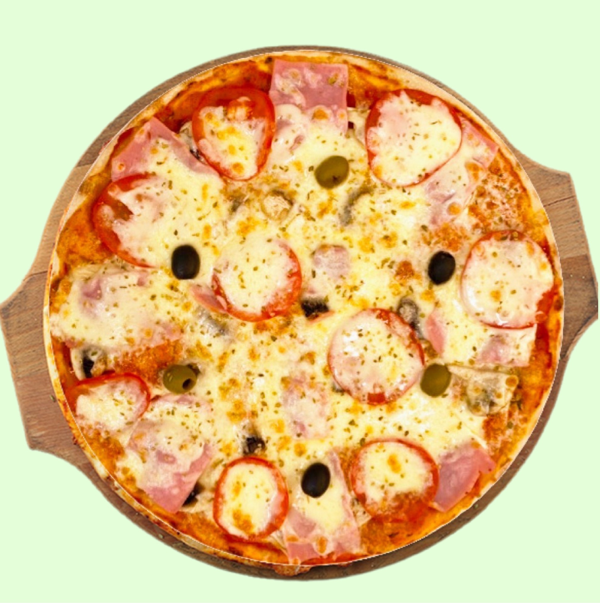 Тесто тонкое, соус томатный, ветчина, грибы шампиньоны, помидоры, оливки, маслины, сыр моцарелла. 960гр