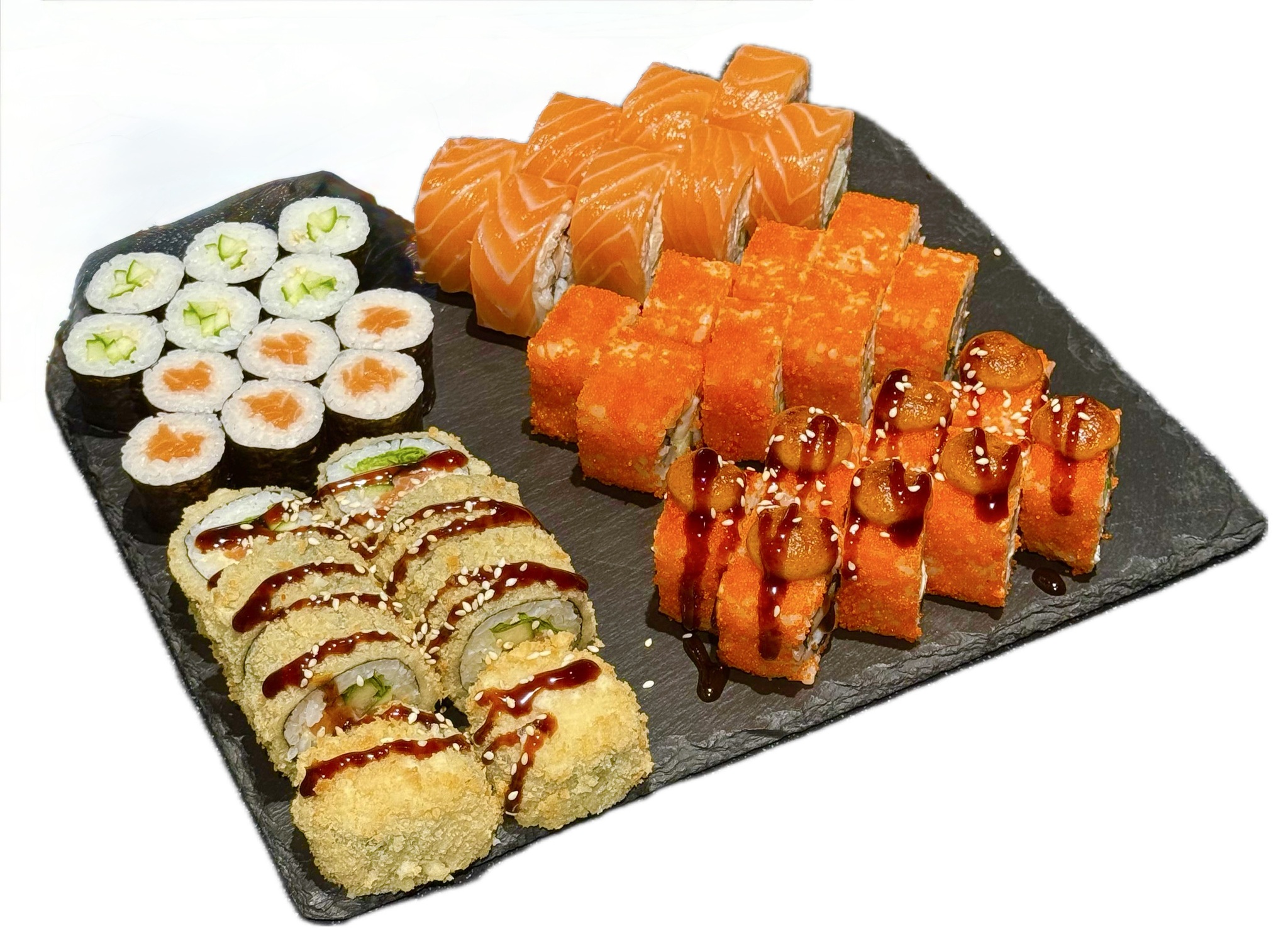 Грейт ролл - Рис, нори, сливочный сыр, огурец, лосось, тигровая креветка, масаго, спайси соус запеченный.