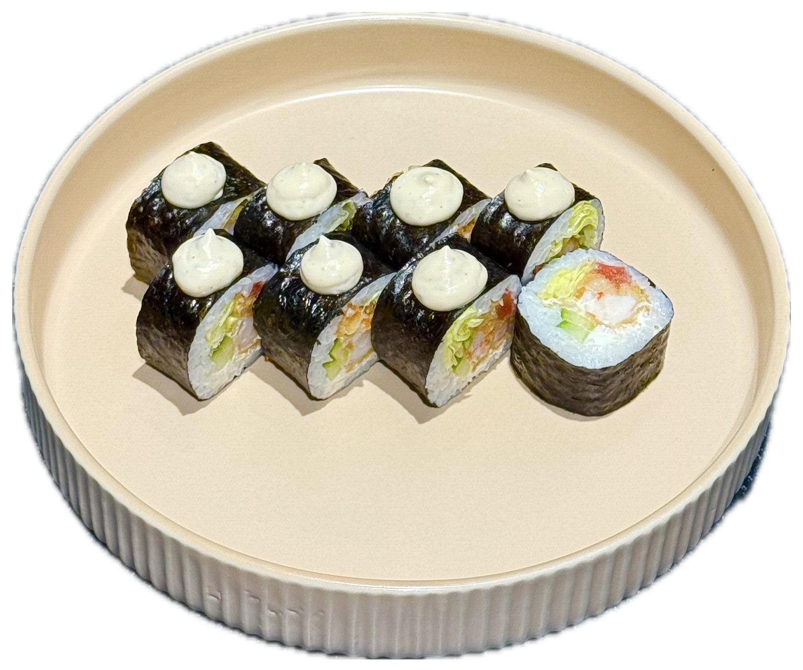 Рис, нори, сливочный сыр, лист салата, огурец, помидор, креветка темпура, чесночный соус.