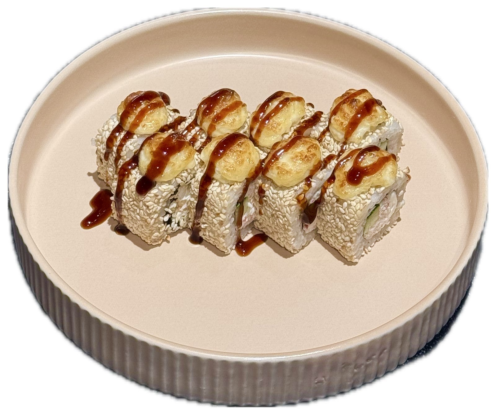 Рис, нори, сливочный сыр, огурец, имитация краба, кунжут, японский майонез.