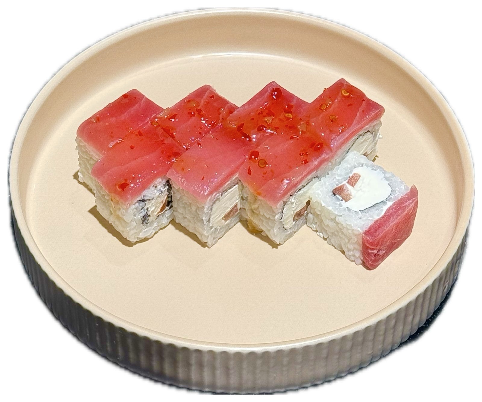 Рис, нори, сливочный сыр, помидор, тунец.