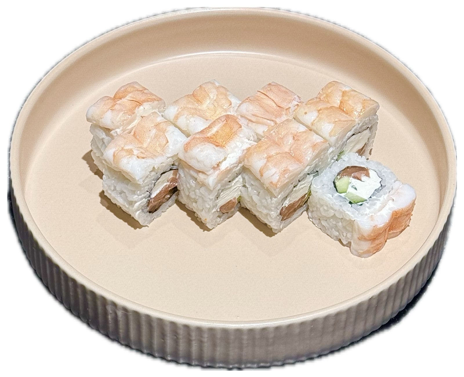 Рис, нори, сливочный сыр, огурец, лосось, креветка тигровая.