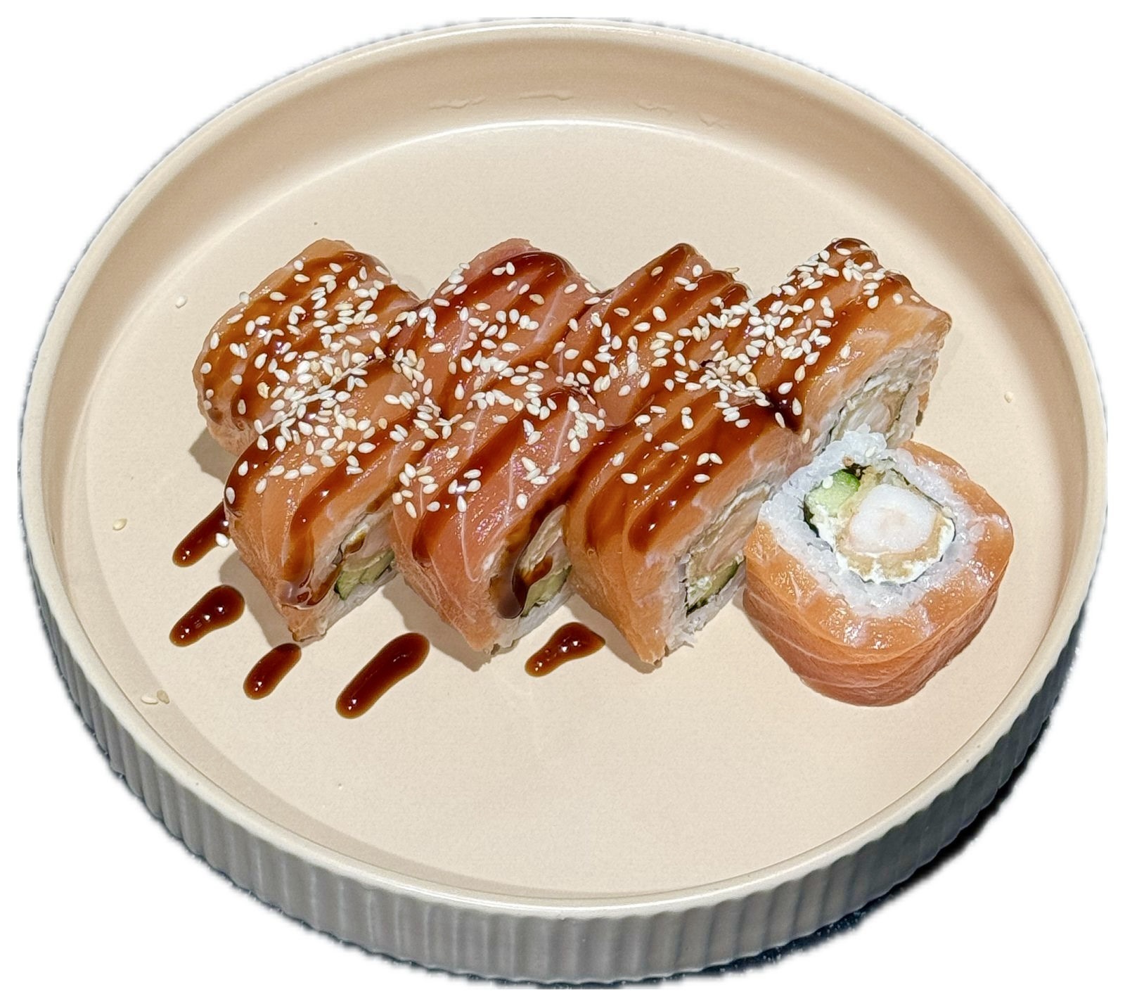 Рис, нори, сливочный сыр, огурец, креветка темпура, лосось, унаги соус