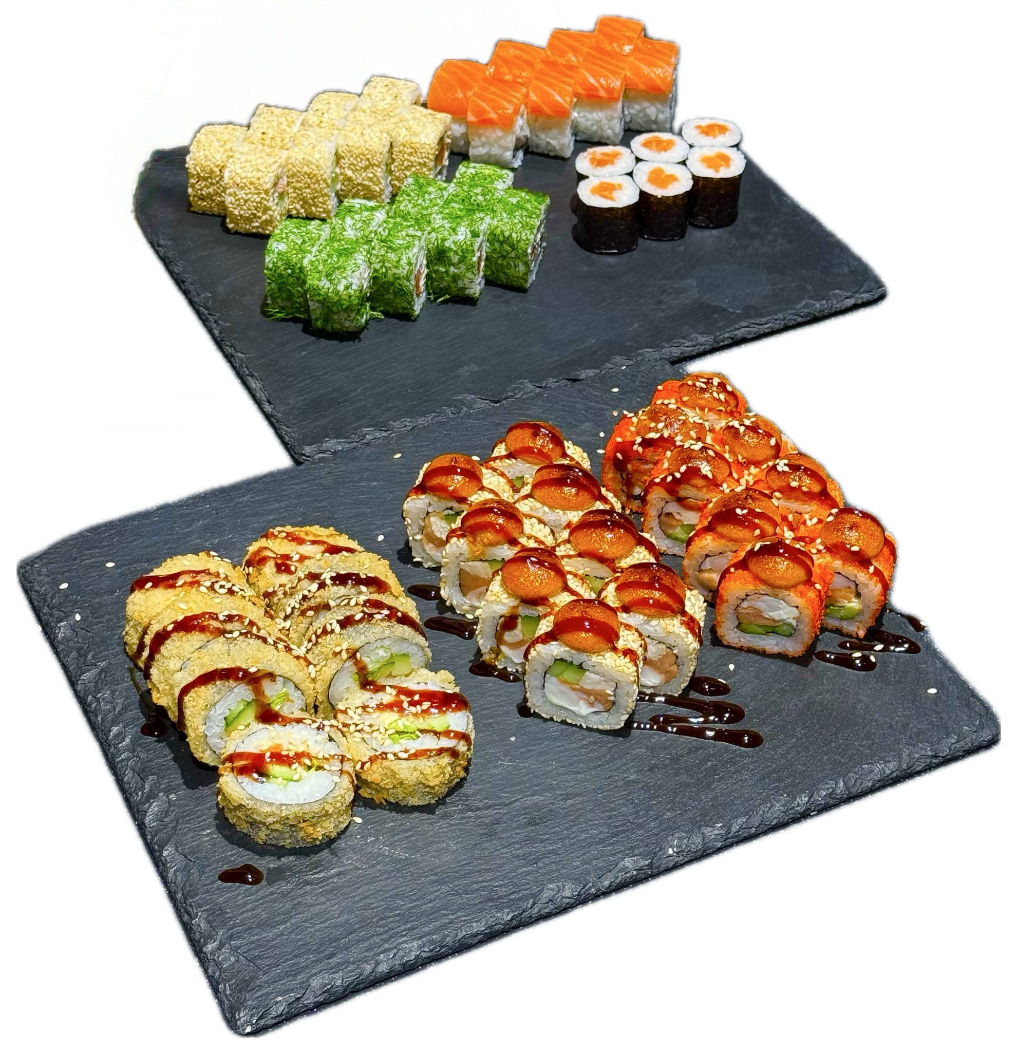 Грейт ролл- Рис, нори, сливочный сыр, огурец, лосось, тигровая креветка, масаго, спайси соус запеченный.