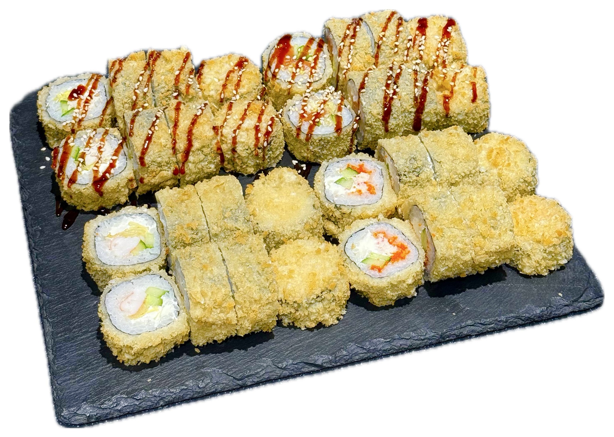 Кани темпура- Рис, нори, сливочный сыр, огурец, масаго, имитация краба, унаги соус, кунжут.