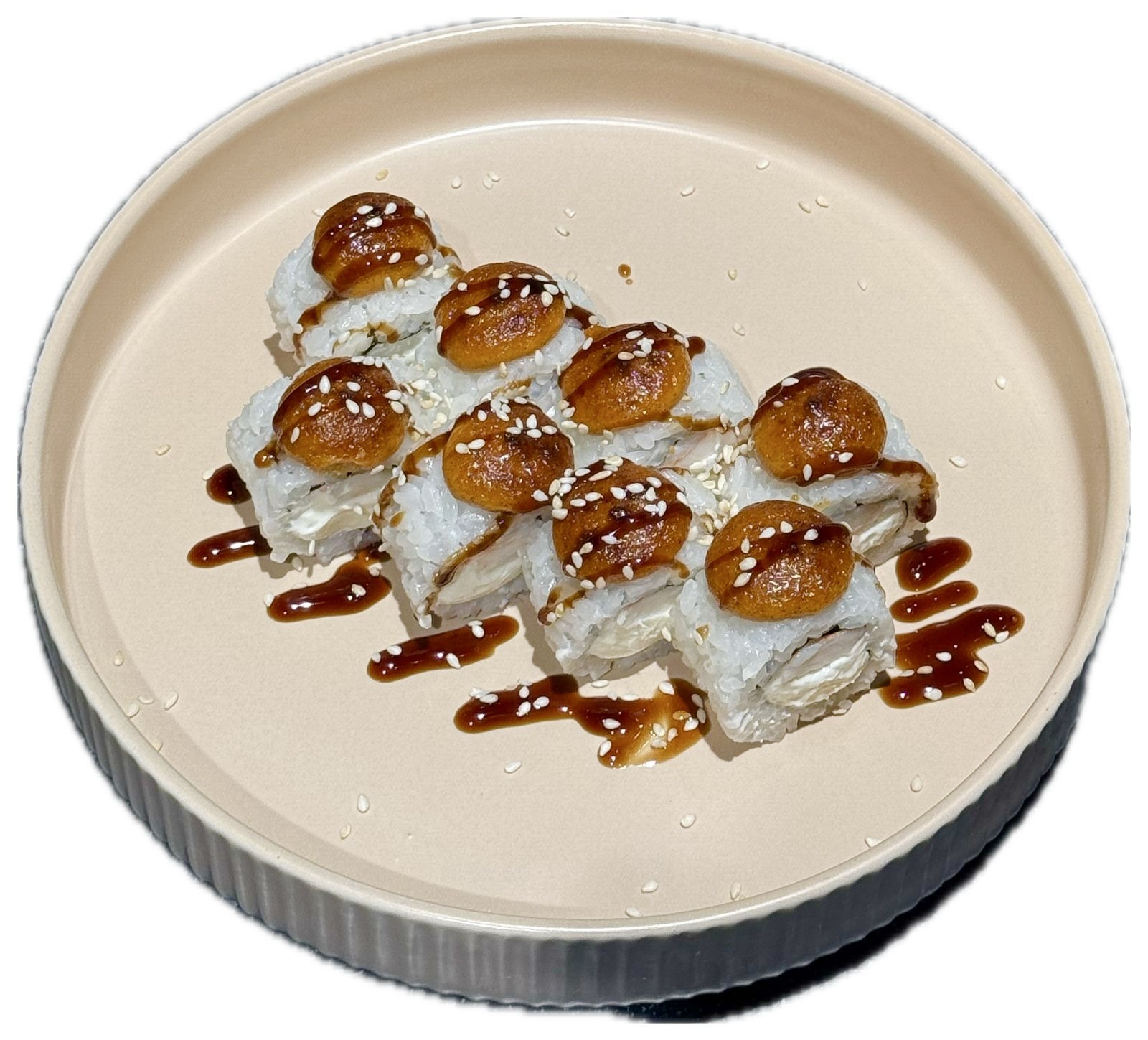 Рис, нори, сливочный сыр, тигровая креветка, спайси соус.