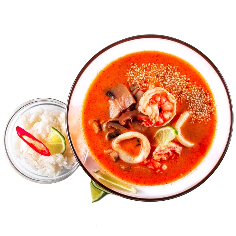 Том ям — ароматный суп с морепродуктами, в котором тигровые креветки, кальмары и осьминоги гармонично сочетаются с кокосовым молоком, томатами черри и шампиньонами, а лайм и кинза придают блюду яркий вкус.