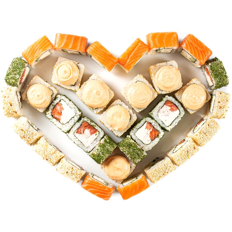 Рис, нори, сливочный сыр, огурец, лосось.