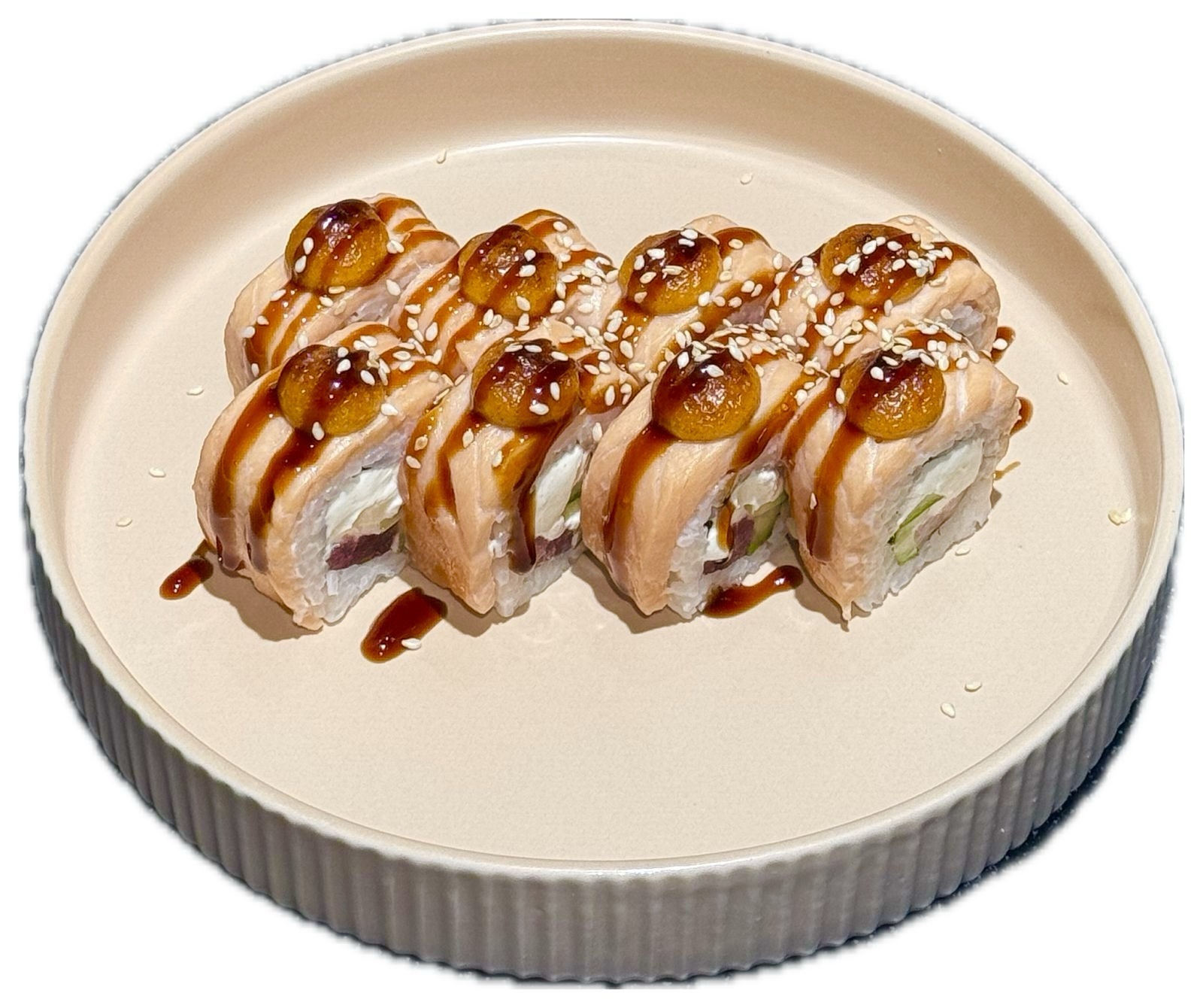 Рис, нори, сливочный сыр, огурец, тунец, лосось, спайси соус