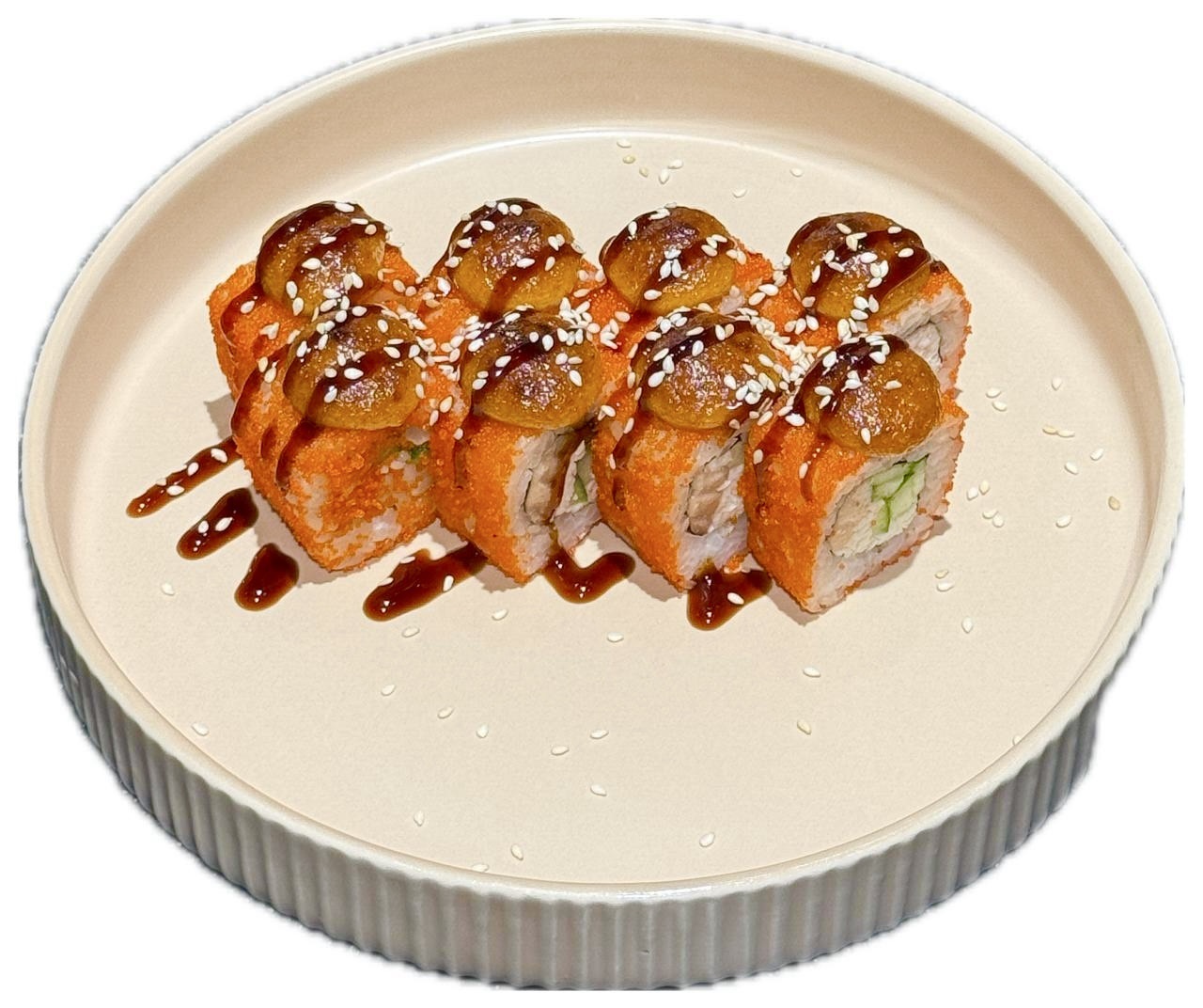 Рис, нори, огурец, лосось, имитация краба, масаго, спайси соус